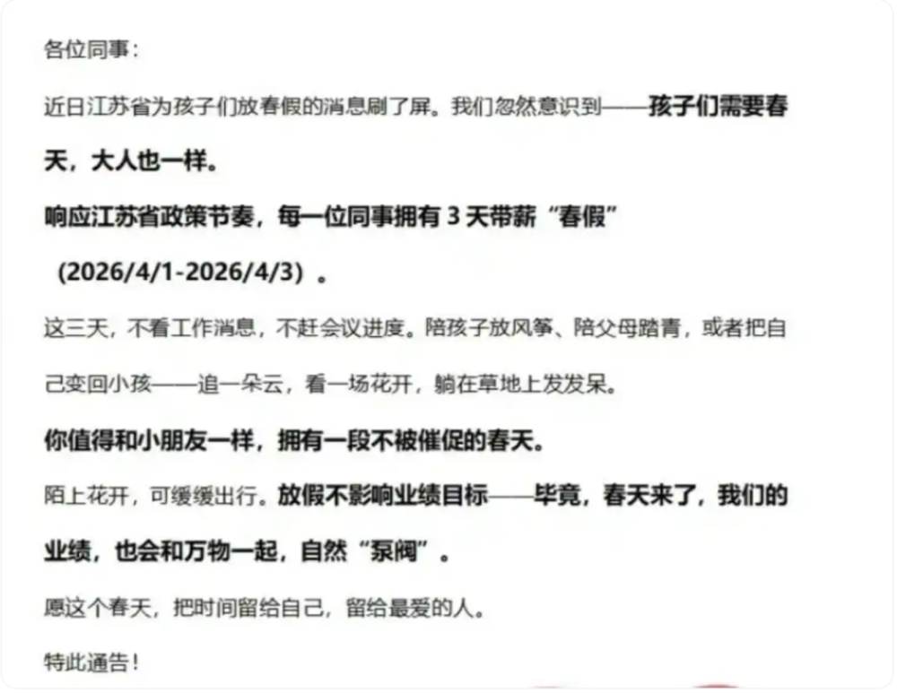 前不久,江苏昆山的一家机电设备公司表示,全体员工将享受年休假之外的三天带薪春假,前后不调休。通知中的一句“大人和孩子都需要‘春天’”戳中了不少网友,不用挤在节假日扎堆出行,不用在工作和陪伴孩子间两难,职工能趁着春光陪伴家人、放松身心,这份温暖也能让职工更有归属感和工作动力。可见,落实休假制度,从来不是负担,而是凝聚人心、实现双赢的小事。