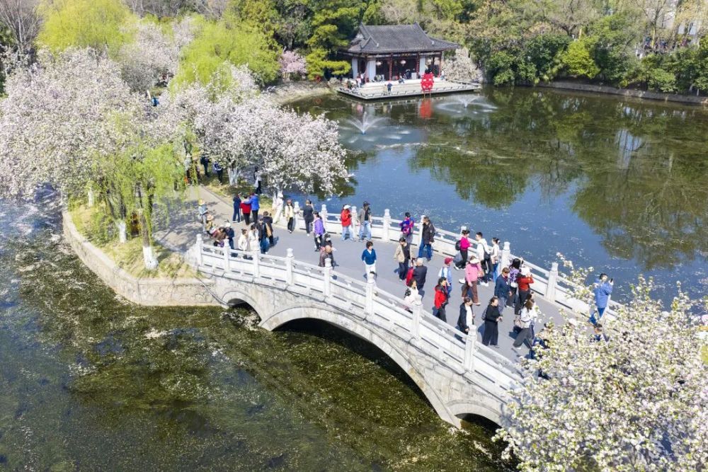 3月29日,游客在江苏南京莫愁湖公园赏花游玩(无人机照片)。新华社发(史俊摄)